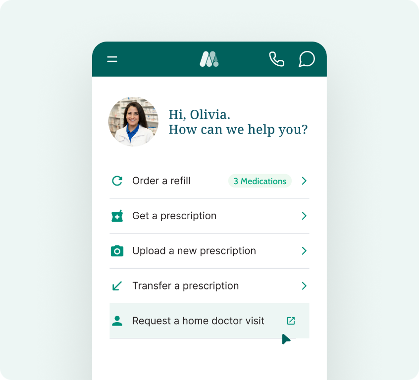 Prescriptions delivered to your door — managed directly by you or a caregiver in the app.