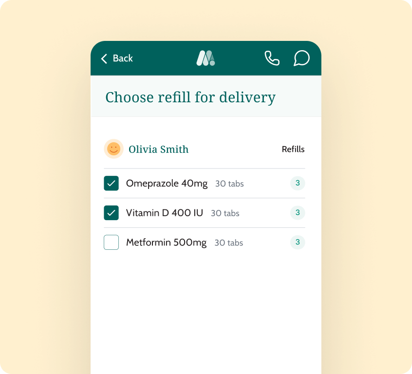 Prescriptions delivered to your door — managed directly by you or a caregiver in the app.