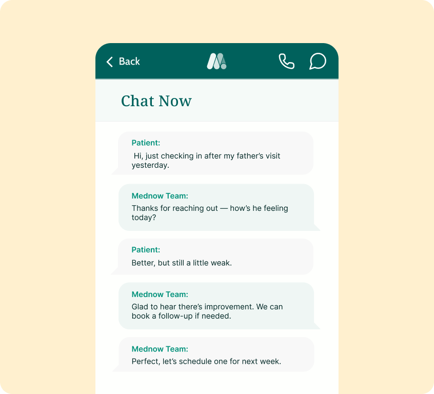 From doctor visits to prescriptions, everything happens in the Mednow App. Simple, seamless, and designed for you and your loved ones.