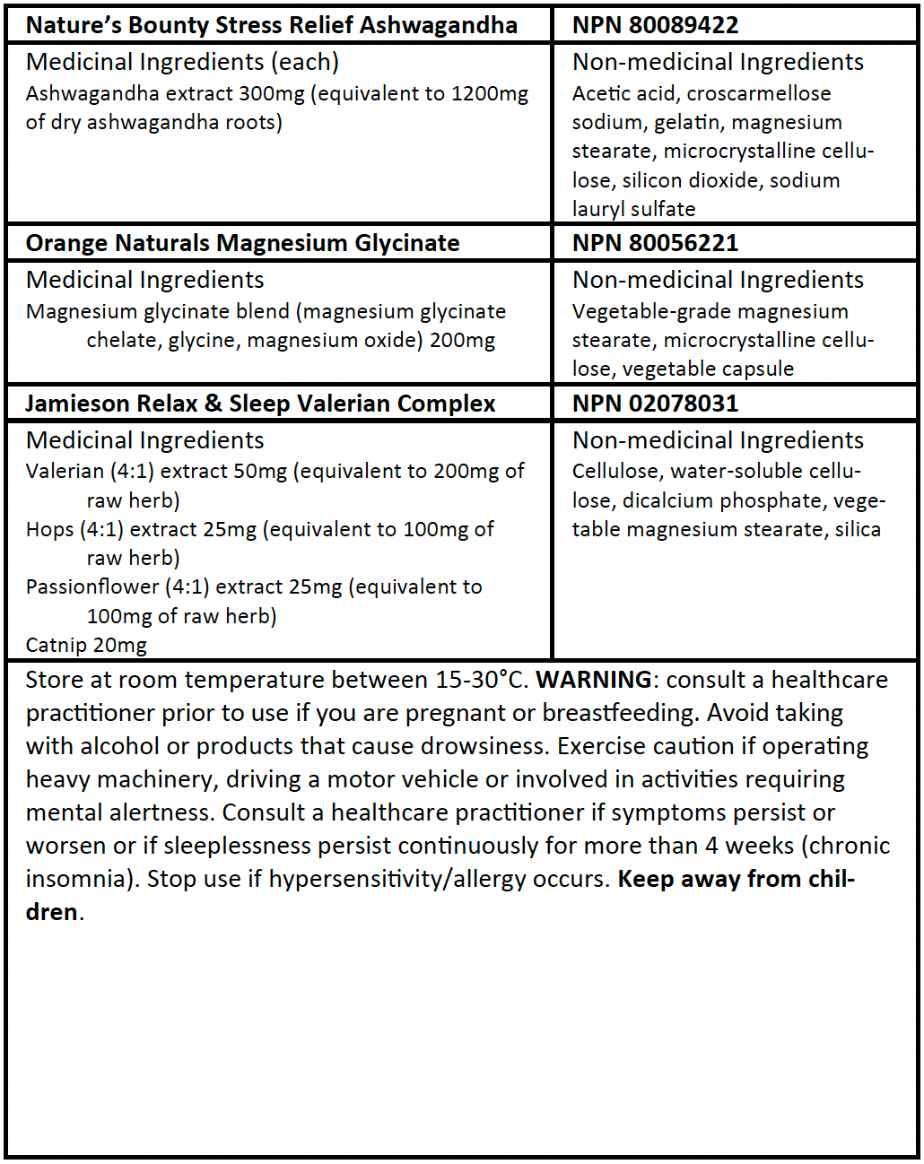 Non-medicinal Ingredients: [Stress Relief Ashwagandha: Acetic acid, croscarmellose sodium, gelatin, magnesium stearate, microcrystalline cellu-lose, silicon dioxide, sodium lauryl sulfate], [Magnesium Glycinate: Vegetable-grade magnesium stearate, microcrystalline cellu-lose, vegetable capsule], [Relax & Sleep Valerian Complex: Cellulose, water-soluble cellu-lose, dicalcium phosphate, vege-table magnesium stearate, silica].